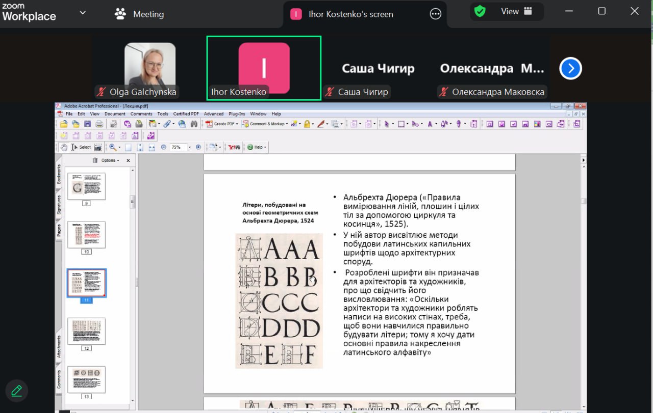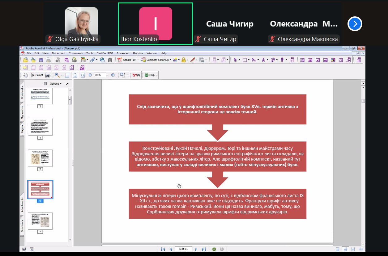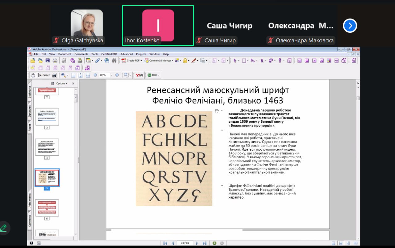 У межах циклу зустрічей, присвячених мистецтву та візуальній комунікації, відбулася лекція доцента Костенка І.О. «Типографіка – від рукописних традицій до цифрових медіа». Під час виступу було простежено шлях розвитку шрифтової культури від середньовічних рукописних трактатів до цифрової доби. Зокрема, наголошувалося, що створення шрифту в давні часи спиралося на точні геометричні побудови та математичні розрахунки, які визначали пропорції кожної літери. Згодом ці вимоги поступово спрощувалися, що дало змогу досягти гармонійного поєднання художньої форми та конструктивної логіки. Важливе місце у лекції відведено майстрам епохи Відродження, які розробили принципи кегельної площі (літера вписувалася у квадрат чи прямокутник) та запропонували використання модульної системи. Саме ці підходи й сьогодні залишаються основою шрифтового дизайну, зокрема в цифрових редакторах та спеціалізованих програмах. Окремий акцент зроблено на класифікації шрифтів, їх типології та правилах поєднання у єдиній композиції. Лектор підкреслив: грамотно підібраний шрифт не лише забезпечує зручність читання, а й створює емоційний настрій, формує сприйняття тексту та посилює його смислове навантаження. Було розглянуто ключові елементи шрифтової форми, що впливають на динаміку чи статику композиції, та наведено практичні поради для дизайнерів і редакторів. Значну увагу приділено також параметрам верстки — кеглю, довжині рядка, інтерліньяжу — й методам їх оптимізації залежно від завдань видання. Саме ці чинники визначають комфортність сприйняття тексту та візуальний баланс сторінки. У цифрову добу типографіка зазнає нових трансформацій. Розглядалися формати шрифтів для друку та вебсередовища, особливості побудови контурних гарнітур, а також процеси растеризації, які впливають на якість відтворення літері. Лектором відзначено зростаючу роль варіативних шрифтів, що дають змогу динамічно змінювати товщину, ширину чи нахил, а також розвиток кінетичної типографіки, яка активно застосовується у відеоконтенті на таких платформах, як YouTube, Instagram та TikTok.Завершуючи лекцію, доповідач підкреслив, що типографіка завжди відображає культурні та стилістичні вимоги часу, що відображується у стильових категоріях. Так, строгий і функціональний швейцарський стиль ХХ століття у сучасних умовах трансформувався та дав народження  менш консервативному стилю, більш вільному у дизайнерських рішеннях,  проте  зберігшому структурність і впливовість.