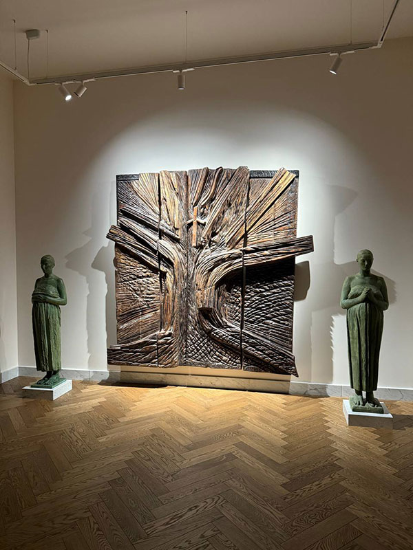 Особливу увагу здобувачів привернула частина колекції, присвячена творчості сучасного українського митця Олександра Животкова. Роботи художника є прикладом глибокої духовної виразності, де матеріальність дерева поєднується з медитативністю образу та філософською глибиною.