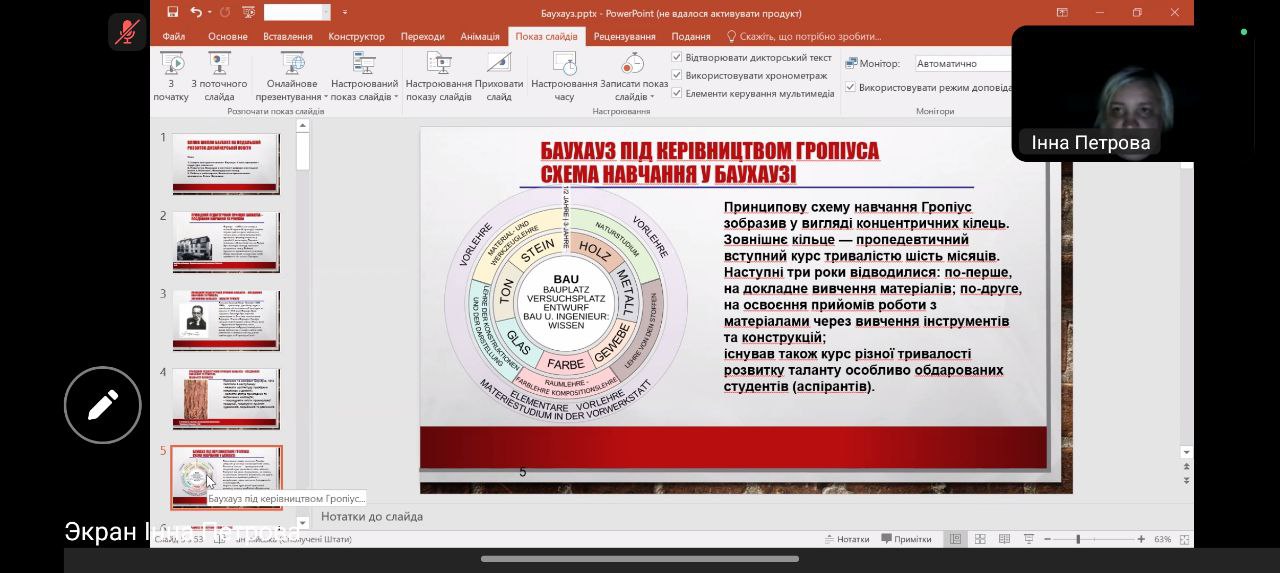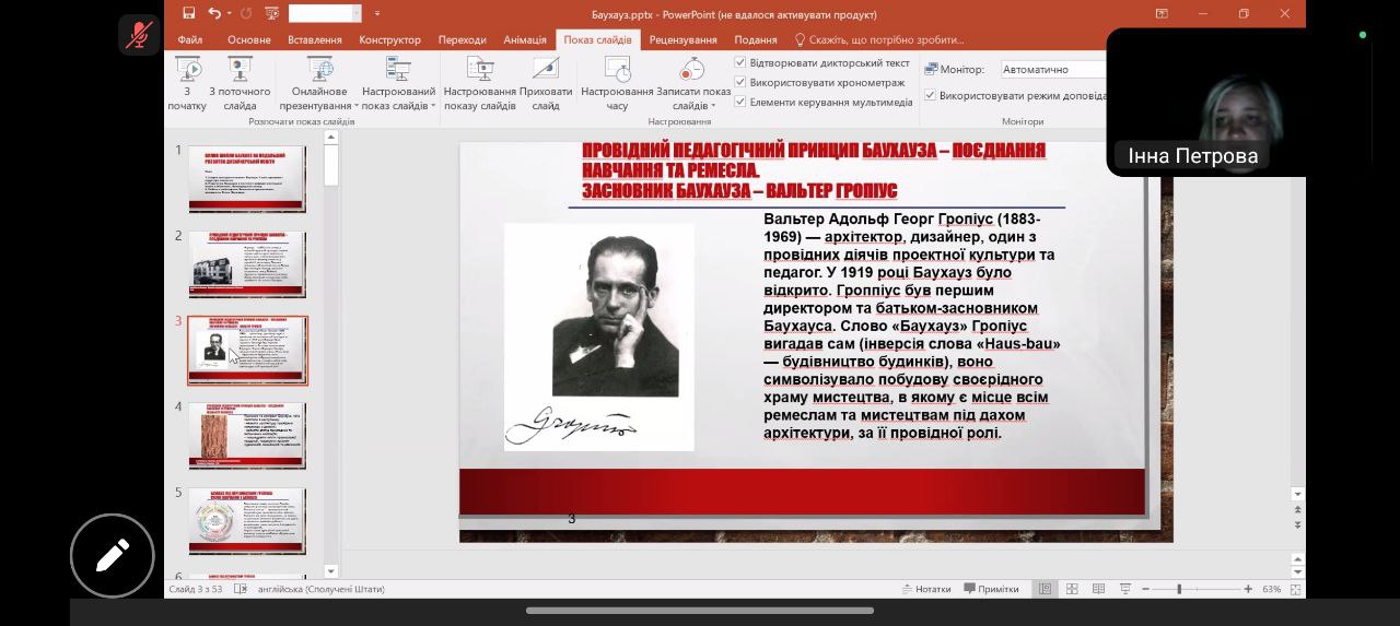 Під час лекції І. Петрова виокремила три етапи у розвитку школи Баухауз: