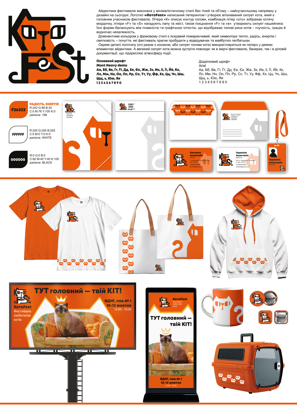Айдентика виконана у стилі мінімалізм. Головна особливість – логотип-летеринг, схожий на силует кота, що разом із основним яскраво-помаранчевим кольором передає тепло та святкову енергію фестивалю.