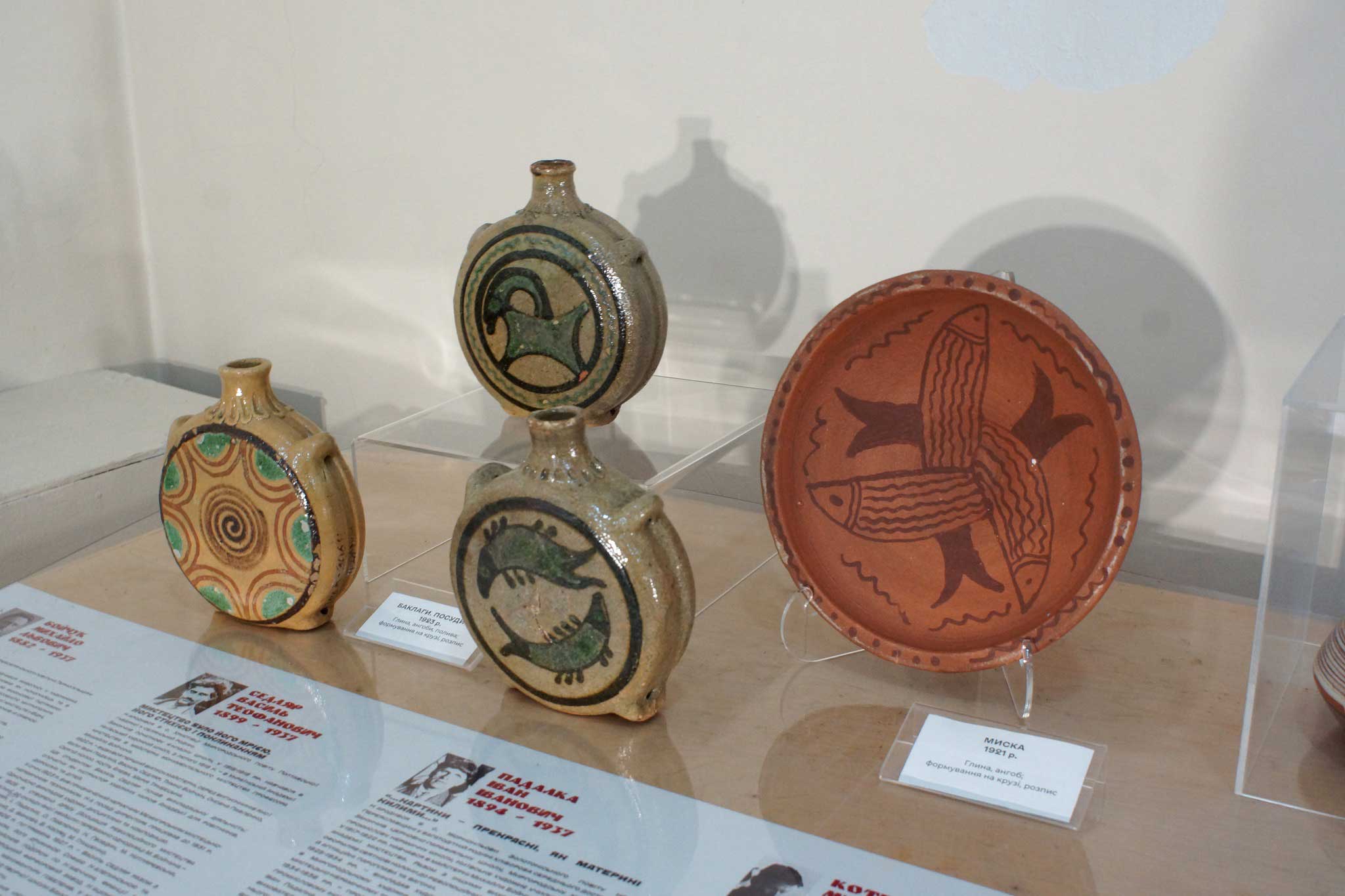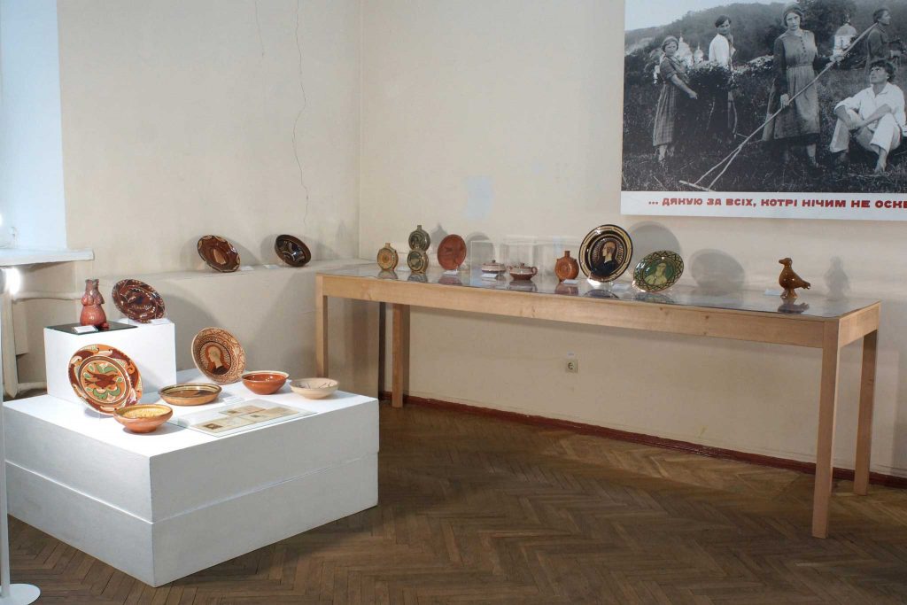 В експозиції представлені студентські роботи Межигірського керамічного технікуму, а також архівні документи та фотоматеріали.