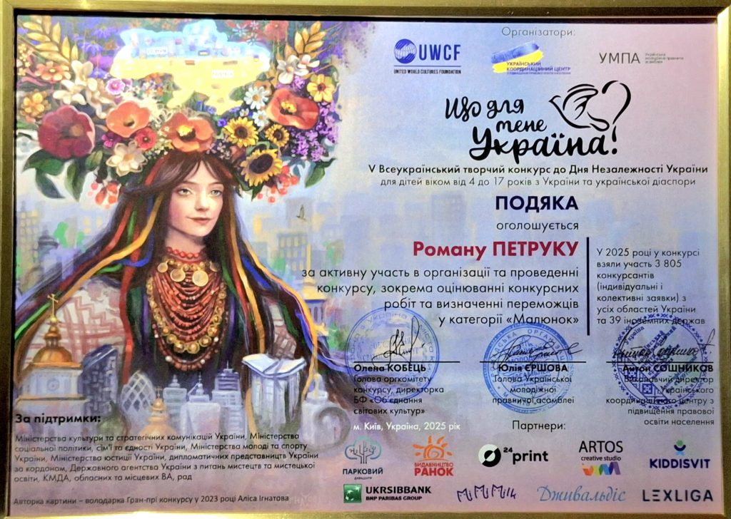 З метою культурно-освітнього розвитку, формування у дітей і підлітків національної ідентичності, патріотичного виховання; збереження культурної спадщини Українського народу; соціальної підтримки талановитої молоді, сприяння їхній самореалізації та творчому розвитку, активного залучення творчої молоді до соціально-вагомої діяльності; популяризації волонтерської діяльності дітей та підлітків в умовах воєнного стану; надання благодійної допомоги дітям-сиротам та дітям, позбавленим батьківського піклування, Благодійний фонд «Об’єднання світових культур» / United World Cultures Foundation / UWCF (головний організатор), Український координаційний центр з підвищення правової освіти населення, Українська молодіжна правнича асамблея провели V Всеукраїнський творчий конкурс «Що для мене Україна?», приурочений до Дня Незалежності України.