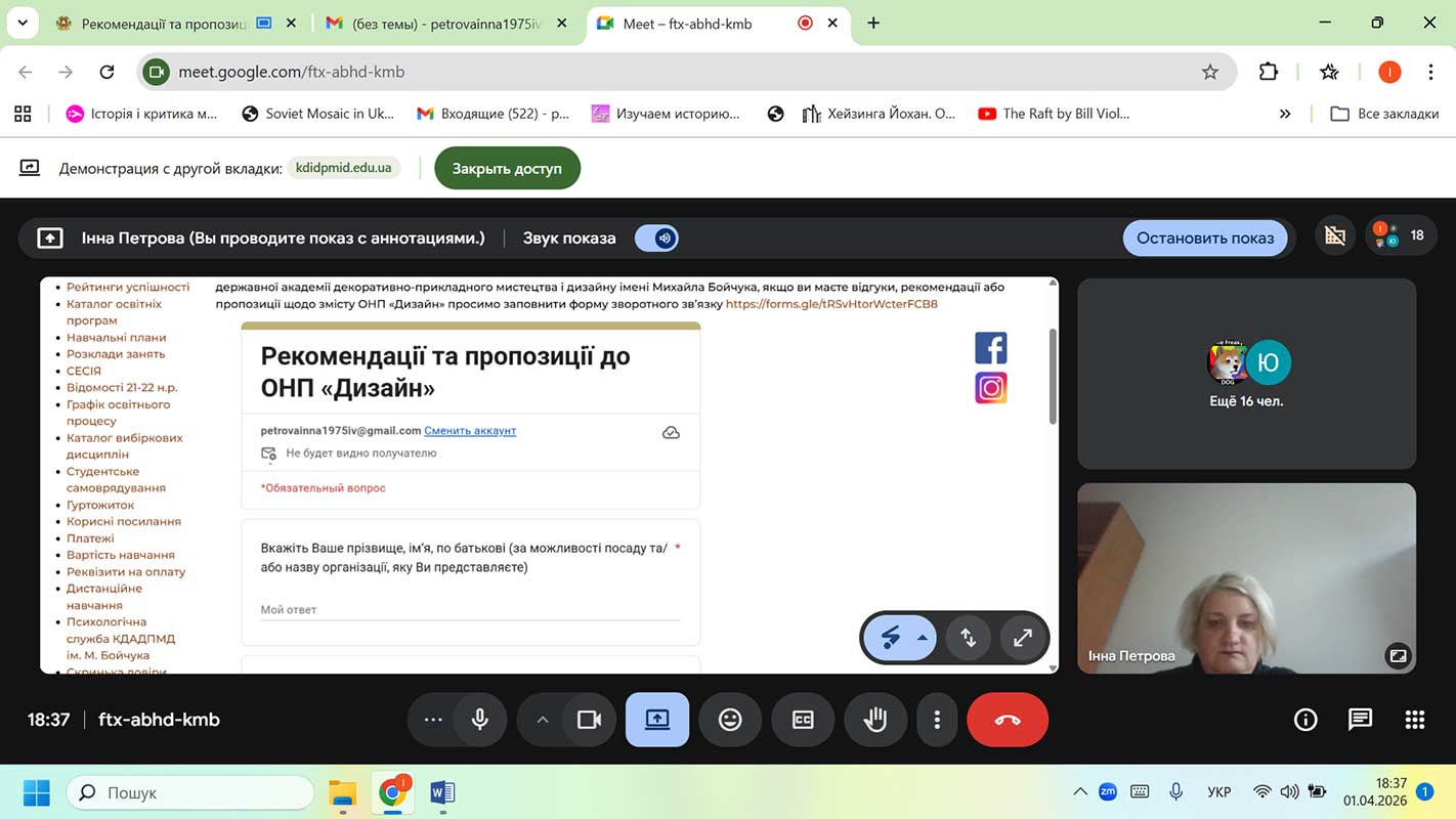26 січня 2026 р. на кафедрі мистецтвознавства та мистецької освіти відбулося громадське обговорення ОНП «Дизайн. На засіданні кафедри були присутні: стейкголдери О. Оленіна, завідувач кафедри образотворчого мистецтва та дизайну ХНУМГ ім. О.М. Бекетова, професор кафедри дизайну Київського столичного університету імені Бориса Гринченка; науково-педагогічні працівники кафедри мистецтвознавства та мистецької освіти, графічного дизайну та промислового дизайну та комп’ютерних технологій: О. Гальчинська, О. Михайлюк, О. Кравченко, О. Михайлюк, І. Петрова, О. Леонтьєва, О. Сосік, В. Берковський, М. Бистра, О. Васкевич, Д. Козловська, О. Романова, Т. Малік. Серед учасників засідання, які взяли активну участь в обговоренні нововведень і обґрунтуванні змін до освітніх програм були здобувачі третього (освітньо-наукового рівні) ОНП «Дизайн» (К. Насєдкін, О.Галіздра, Т. Грушовський, І. Растворов). Головував на засіданні завідувач кафедри промислового дизайну та комп’ютерних технологій Ю. Ковальов (гарант ОНП Дизайн). Після тривалого обговорення було прийнято рішення про зміну назви навчальної дисципліни «Універсальний дизайн» на «Універсальний та інклюзивний дизайн». Також було прийнято рішення про оновлення переліку вибіркових дисциплін.