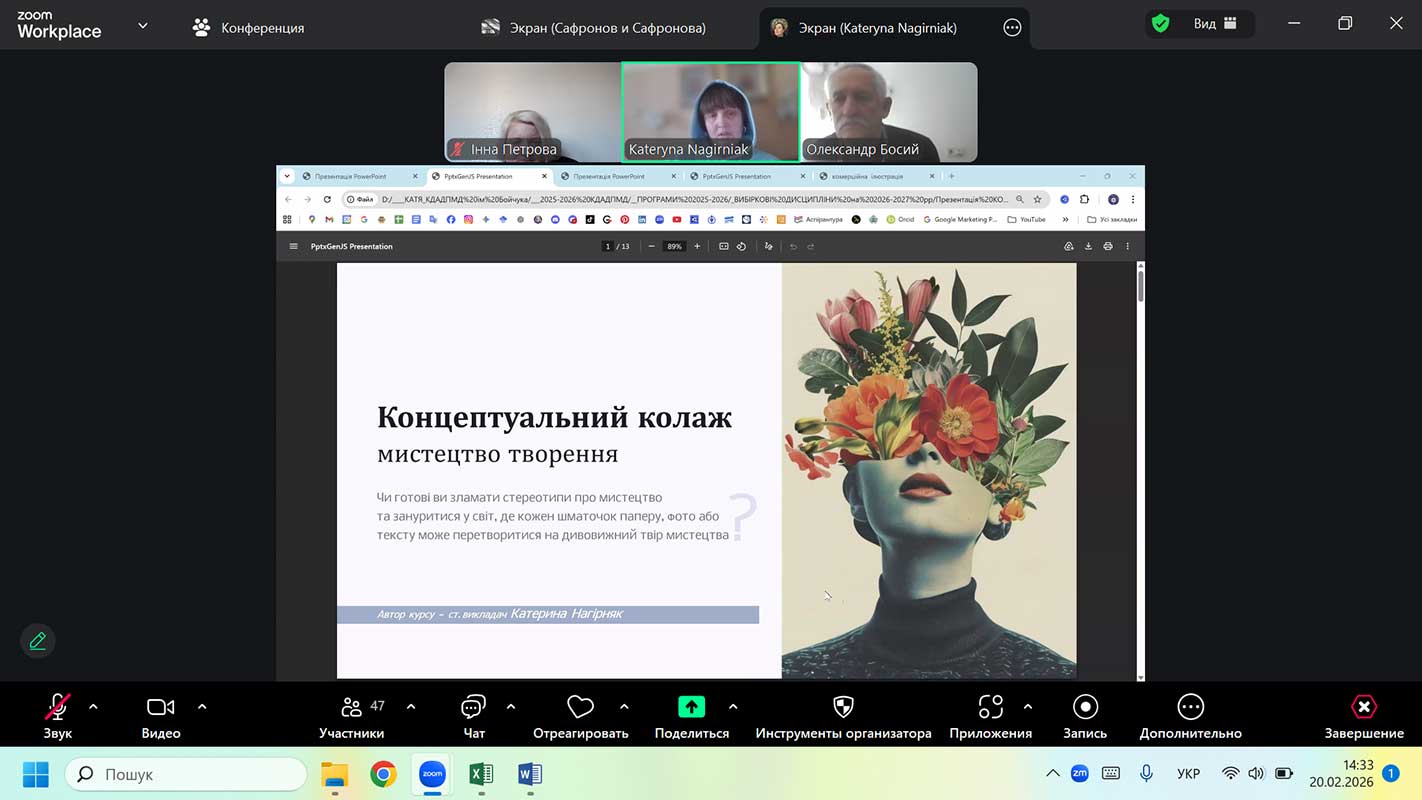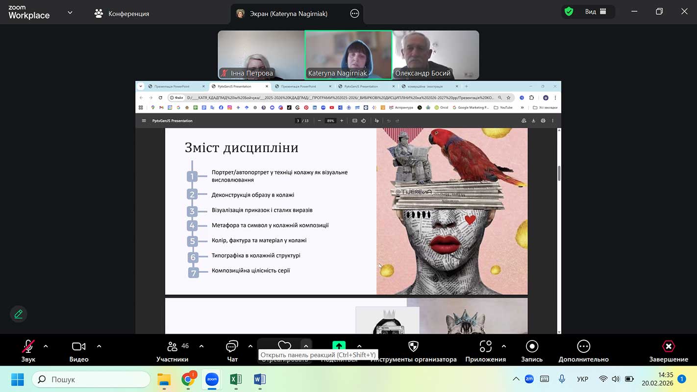 4-6 лютого 2026 р. студенти 1, 2, 3 курсу (ОПП «Графічний дизайн») знайомилася з презентацією вибіркових дисциплін на 2026-2027 н.р. Так, здобувачів вищої освіти 3 курсу було ознайомлено з такими предметами «Електронне портфоліо», «Артбук», «Інтролігація», «Техніки офорту», «Ділова комунікація в мистецькій сфері», «Моушн-дизайн», «Стилістичні прийоми графічного рисунку», «Краса людського тіла в мистецтві», «Філософські арт-практики в художній культурі» тощо. Здобувачів вищої освіти 2 курсу було ознайомлено з такими дисциплінами як: «Комерційна ілюстрація», «Летеринг», «Основи анімації», «Ботанічний живопис», «Скульптура», «Артшрифт», «Рисунок за фахом», «Практикум з художньої кераміки», «Веб та медіадизайн», «Штучний інтелект як інструмент дизайнера», «Сучасні арт та дизайн-практики: матеріали, засоби, техніки» тощо. Студенти 1 курсу обирали 2 дисципліни із широкого переліку: «Орнамент в дизайні», «Метафора символів візуальної культури», «», «Основи класичної фотографії», «Моделювання 3D об’єктів», «Концептуальний коллаж», «Англійська мова для візуального сторітелінгу» тощо.