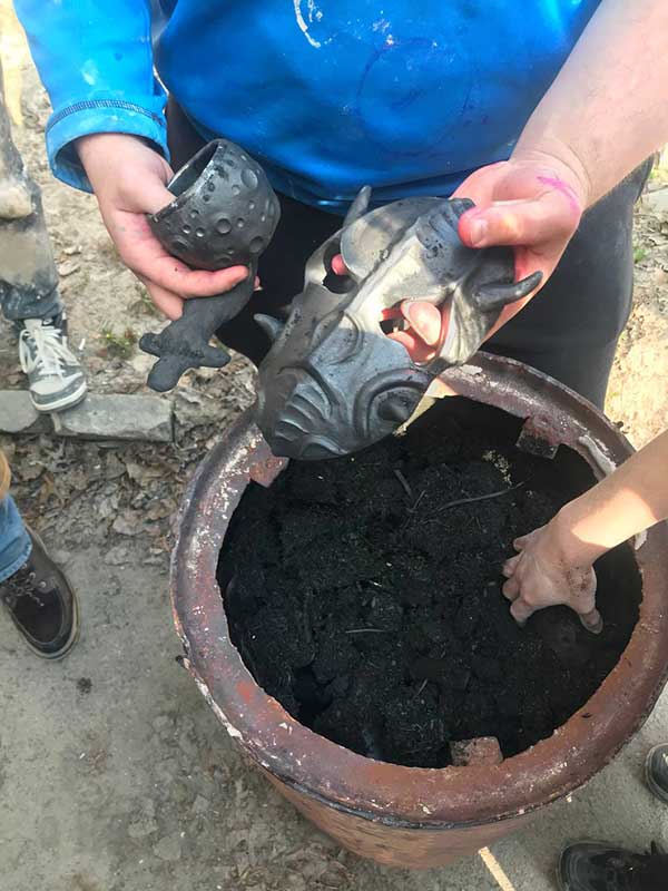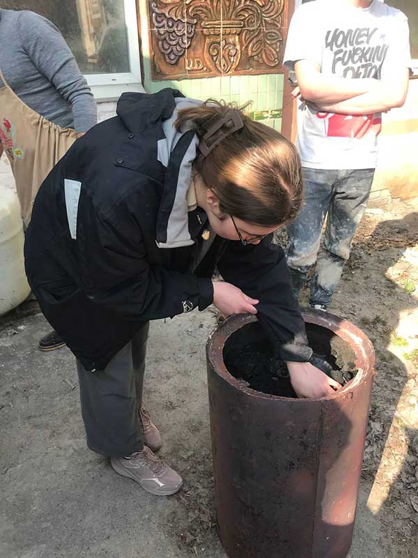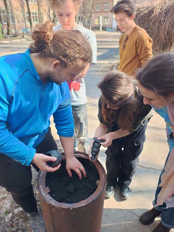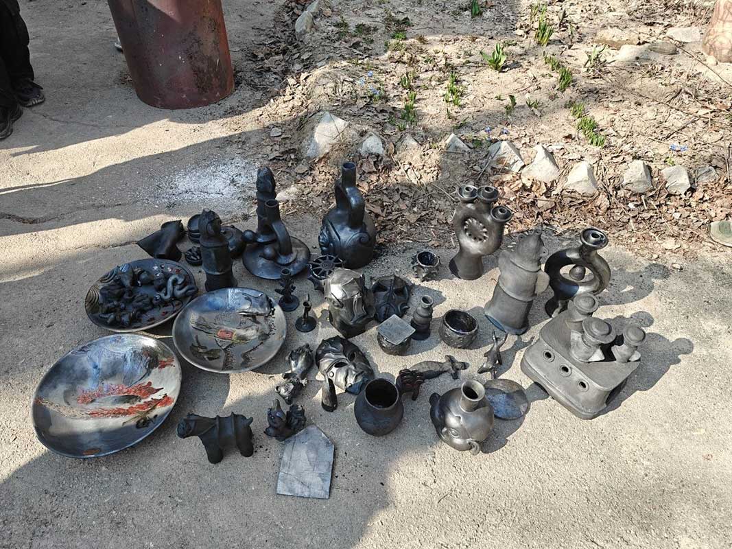 Під час заняття студенти здійснили відкриття печі після чорнодимленого випалу — складного та водночас унікального технологічного процесу, що дозволяє досягати глибоких чорних відтінків і характерної фактурності поверхні кераміки.