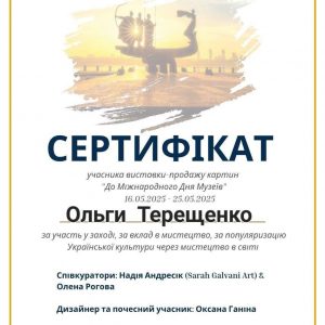 16.05. 2025 – 25.05. 2025 Участь в колективній художній виставці до «Міжнародного Дня Музеїв» Літературно меморіальний музей квартира Павла Тичини. Представлено 3 картини, акварель