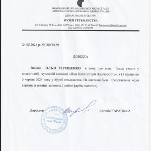 05.06. 2024 Участь в колективній художній виставці «Наш Київ: історія & сучасність» року у музеї гетьмаства. На виставці представлена робота «Берегиня», олія, полотно.
