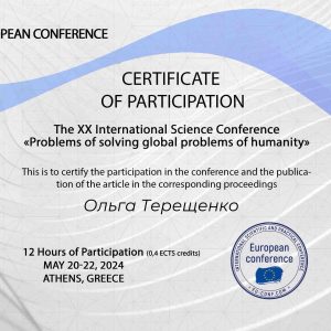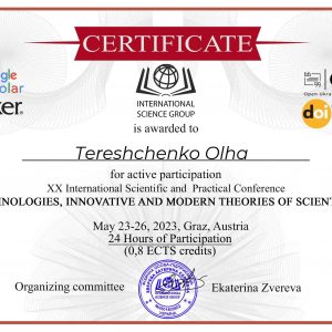 Ольга Григорівна Терещенко працює над дисертаційним дослідженням «Український орнамент в арт- та дизайн – практиках: генезис, трансформація та сучасні інтерпретації» У її науковому доробку – публікації статей в наукових виданнях за темою дослідження, збірники конференцій, лекції за темою дослідження та виставки картин з інтерпретацією українських національних орнаментальних мотивів.