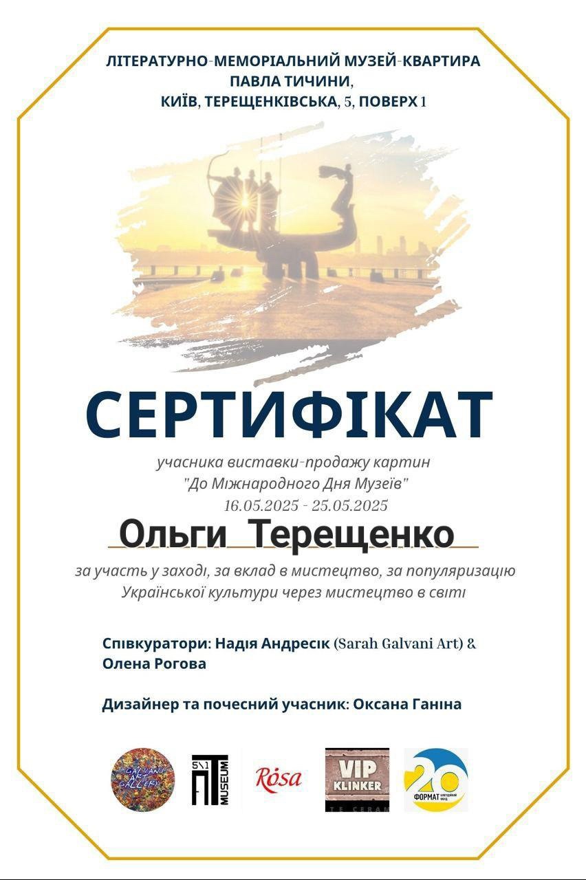 16.05. 2025 – 25.05. 2025 Участь в колективній художній виставці до «Міжнародного Дня Музеїв» Літературно меморіальний музей квартира Павла Тичини. Представлено 3 картини, акварель
