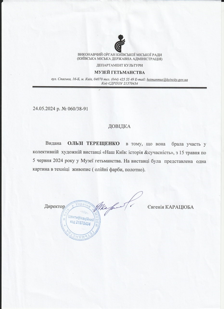 05.06. 2024 Участь в колективній художній виставці «Наш Київ: історія & сучасність» року у музеї гетьмаства. На виставці представлена робота «Берегиня», олія, полотно.