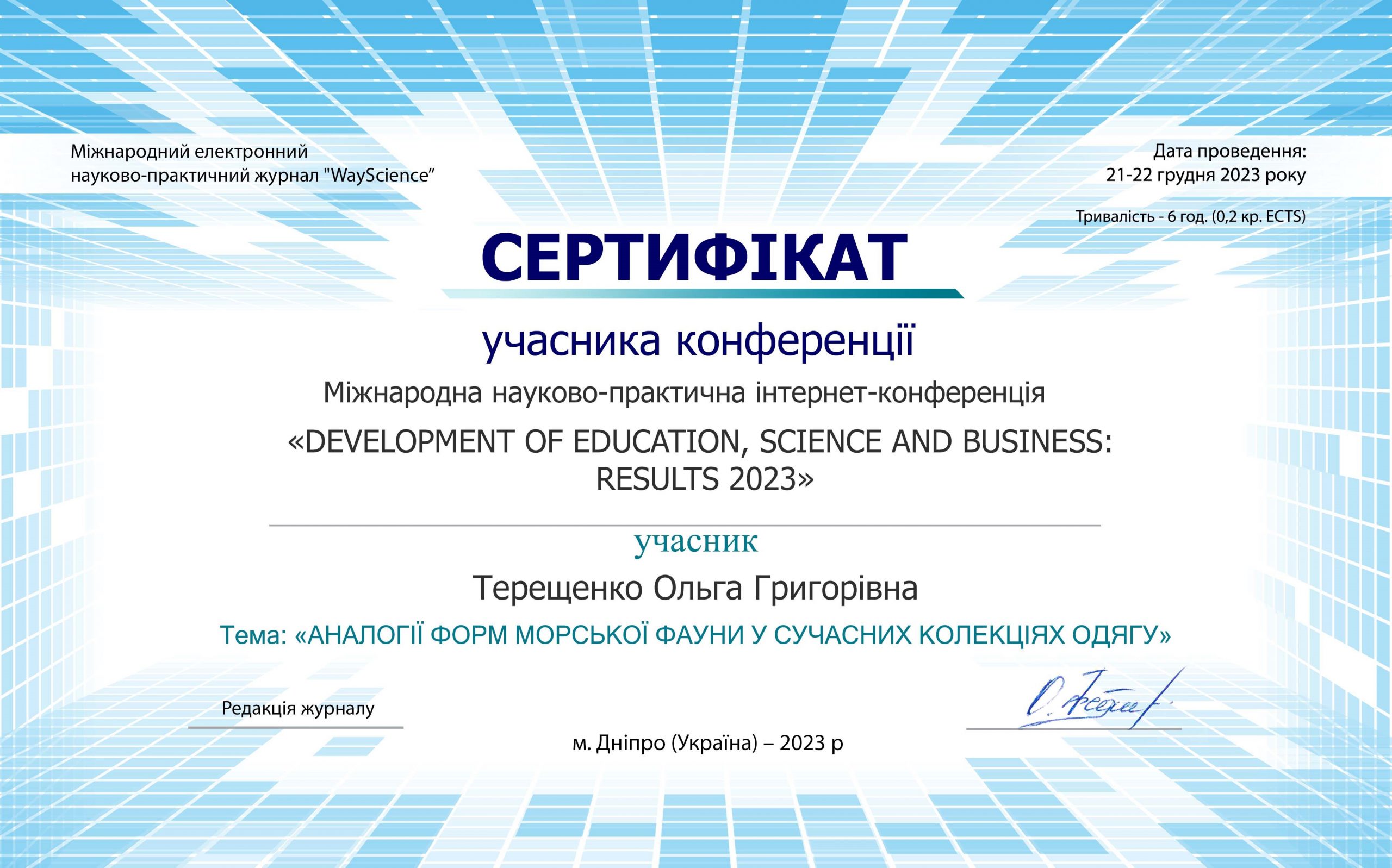 Ольга Григорівна Терещенко працює над дисертаційним дослідженням «Український орнамент в арт- та дизайн – практиках: генезис, трансформація та сучасні інтерпретації» У її науковому доробку – публікації статей в наукових виданнях за темою дослідження, збірники конференцій, лекції за темою дослідження та виставки картин з інтерпретацією українських національних орнаментальних мотивів.